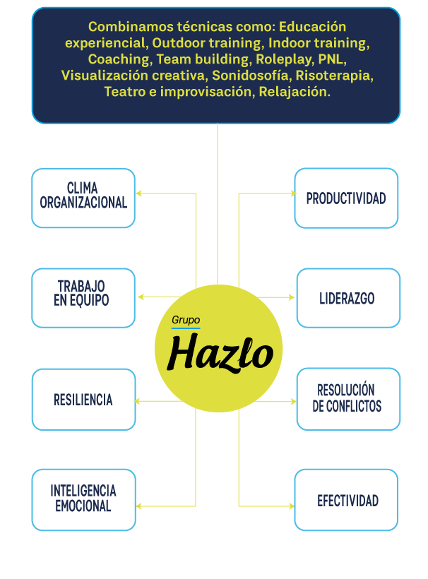 Nuestro ADN corporativo está basado en una metodología propia, construida por un comité científico y fundamentada en aprender haciendo. Integramos educación experiencial, coaching, team building, PNL, visualización creativa, risoterapia, teatro e improvisación para generar transformaciones reales. Este enfoque permite que cada participante fortalezca su auto-observación, su liderazgo y su impacto en el entorno.